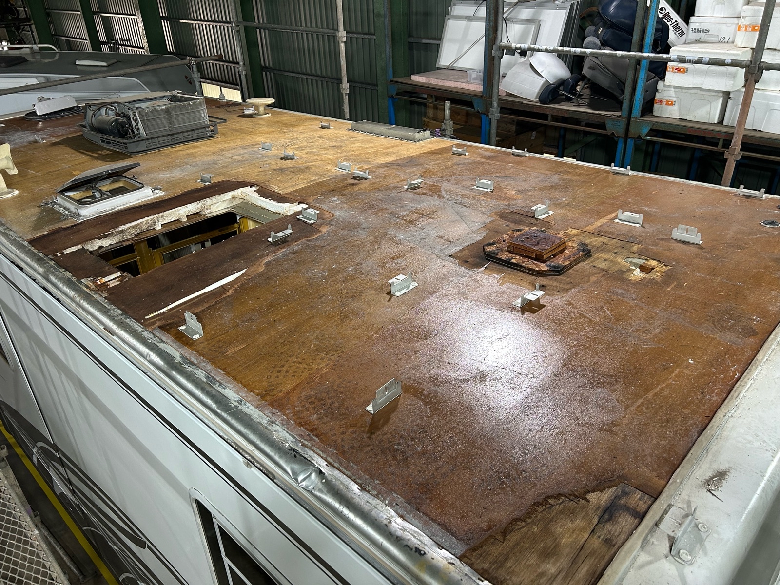 障害物にぶつけてしまった様で屋根が破損してしまい雨漏り発生です。